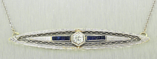 1920s Antique Art Deco 14k Gold 0.25ct Diamond & Sapphire Bar Necklace - 20"