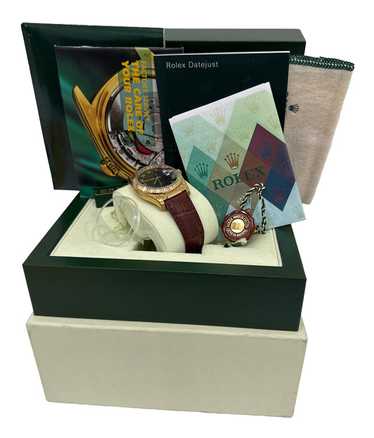 PAPERS Rolex DateJust 36mm BLACK JUBILEE ROMAN 18K Gold Leather Watch 116138 BOX