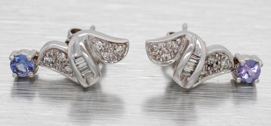 Vintage Blue Tanzanite Swirled Stud Earrings w/ Diamond Accents - 14k White Gold