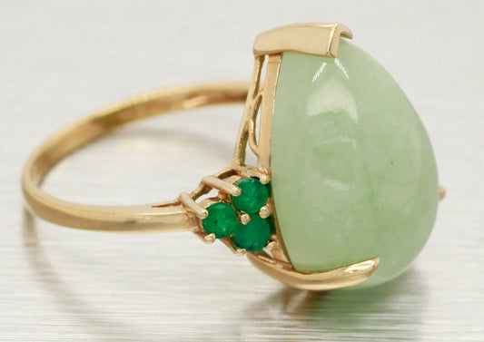 Vintage Large Jade Teardrop Cocktail Ring - Emerald Accents - 14k Yellow Gold