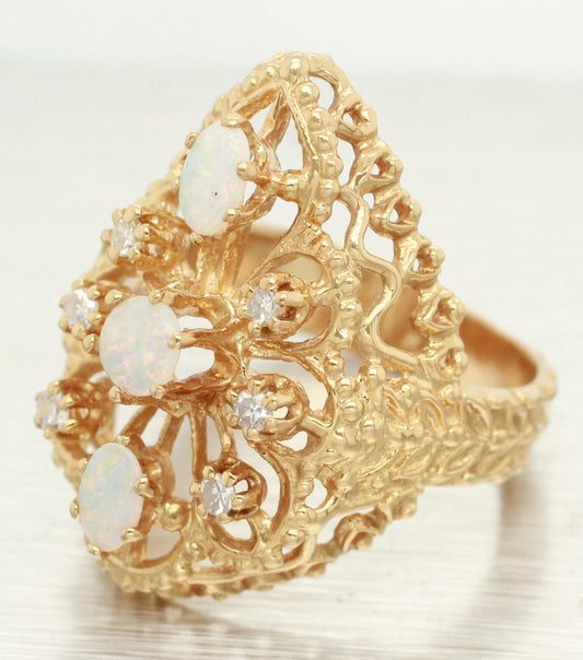 Vintage Opal & Diamond Cocktail Ring - 14k Yellow Gold Teardrop Filigree Setting