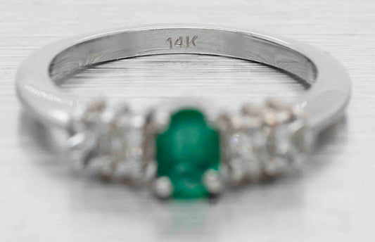 Vintage Oval 0.25ct Emerald & Diamond Accent Engagement Ring - 14k White Gold