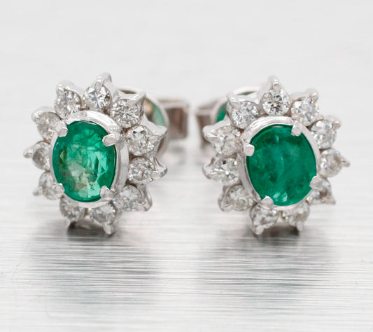 Vintage Oval Emerald & Diamond Halo Stud Earrings - 18k White Gold - Pushbacks