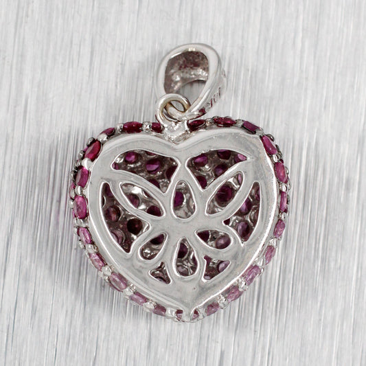 Vintage Pink Ruby Heart Charm Cluster Pendant - 14k White Gold