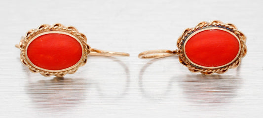 Vintage Red Coral Cabochon Dangle Earrings - 14k Yellow Gold Wireback