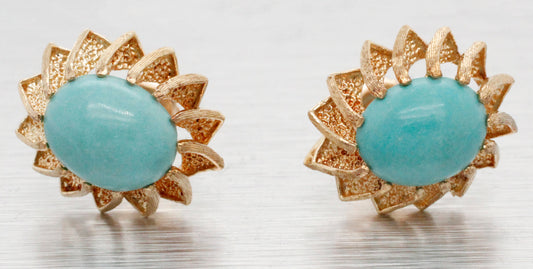 Vintage Turquoise Cabochon Stud Earrings - 14k Yellow Gold