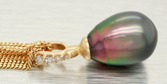 Vintage Tahitian Black Pearl Pendant - 14k Yellow Gold Chain Necklace 18"