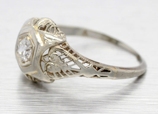 Antique Art Deco 0.20ct Diamond Solitaire Filigree Ring - 18k White Gold | 6.25