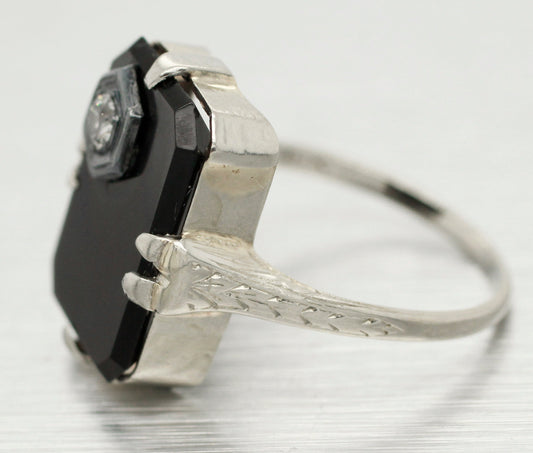 Antique Art Deco 0.05ct Diamond and Onyx Cocktail Ring - 18k White Gold