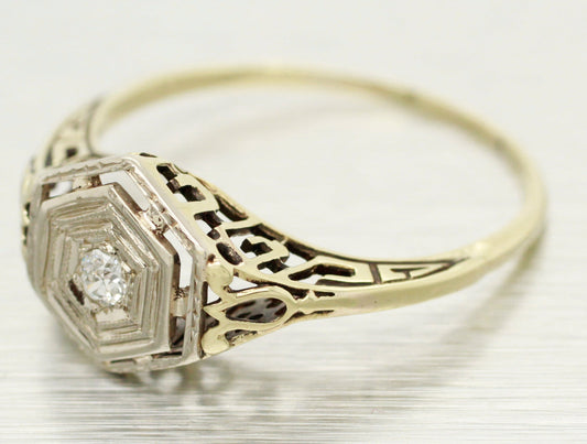 Antique Art Deco 0.05ct Diamond Hexagonal Filigree Band Ring - 14k Yellow Gold