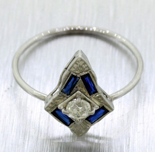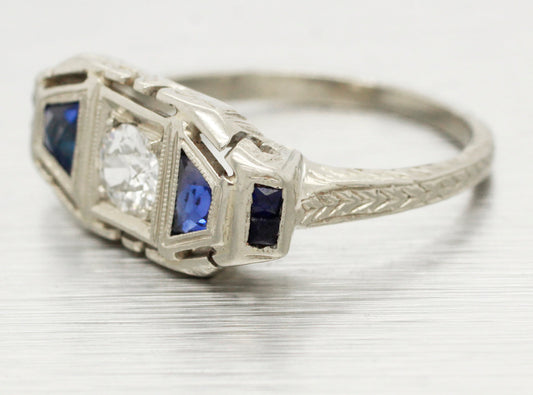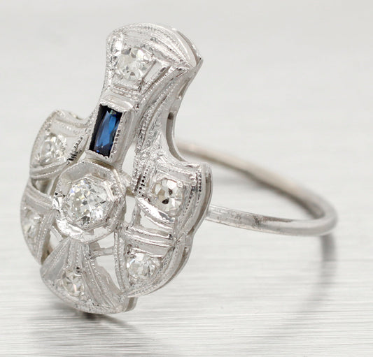 Antique Art Deco 0.40ctw Diamond & Sapphire Cocktail Ring in 18k White Gold