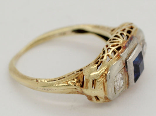 Antique Art Deco 0.30ctw Sapphire & Diamond Filigree Band Ring - 14k Yellow Gold
