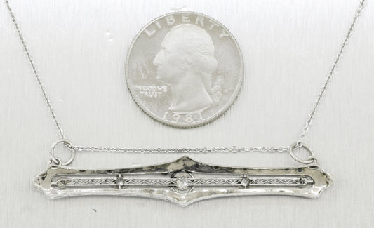 Antique Art Deco 0.45ctw Diamond Filigree Bar Pendant - 14k White Gold Necklace