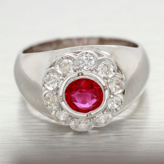 Antique Art Deco 0.75ct Ruby and Diamond Flower Band Ring in 18k White Gold