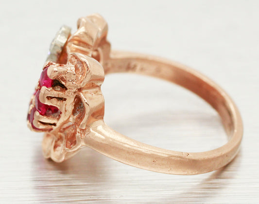 Antique Art Deco 0.50ctw Ruby & Diamond Floral Cocktail Ring - 14k Rose Gold