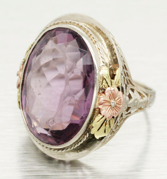 Antique Art Deco Amethyst Cocktail Ring | 14k Tri-Tone Gold Flower Filigree
