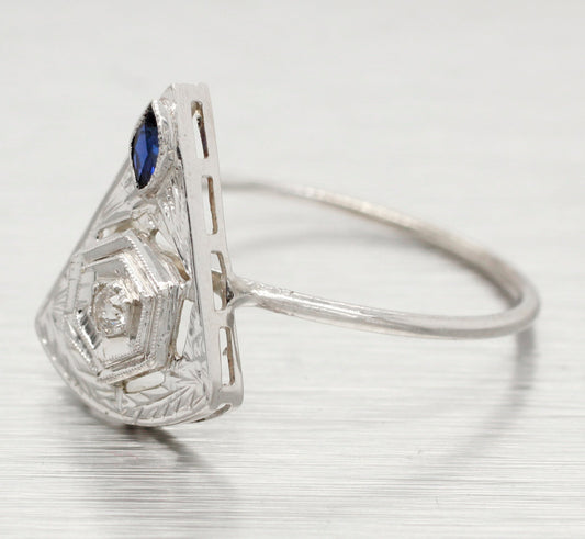 Antique Art Deco Diamond/Sapphire Triangle Pin Conversion Ring - 14k White Gold