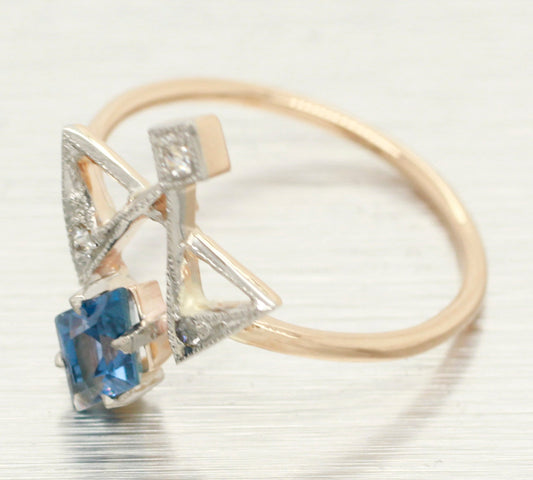 Antique Art Deco Blue Topaz & Diamond Masonic Ring - 18k Yellow Gold