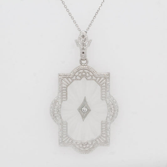 Antique Art Deco Diamond & Rock Crystal Pendant - 14k White Gold Necklace - 17"