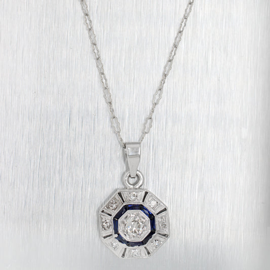 Antique Art Deco Diamond Sapphire Octagon Pendant - 14k White Gold Necklace - 16"