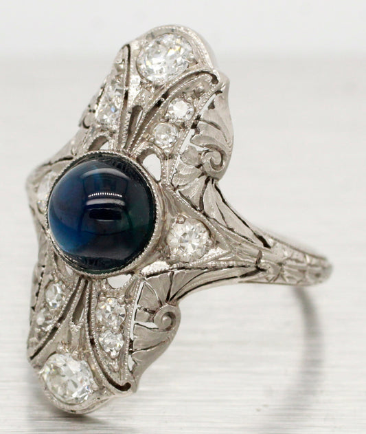 Antique Art Deco Cabochon Sapphire Cocktail Ring - 18k White Gold & Diamonds