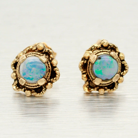 Antique Art Deco Opal Stud Earrings - 14k Yellow Gold Floral Shape