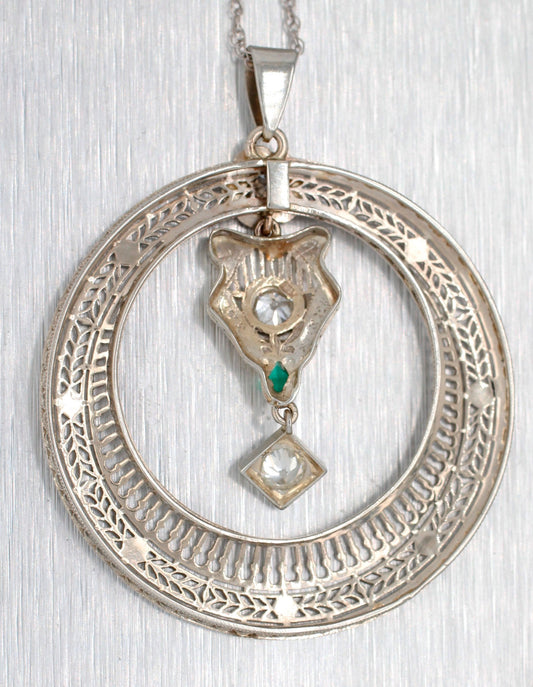 Antique Art Deco Diamond Emerald Open Circle Pendant 14k White Gold 18” Necklace