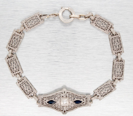 Antique Art Deco Diamond & Sapphire Filigree Bracelet - 14k White Gold - 7”
