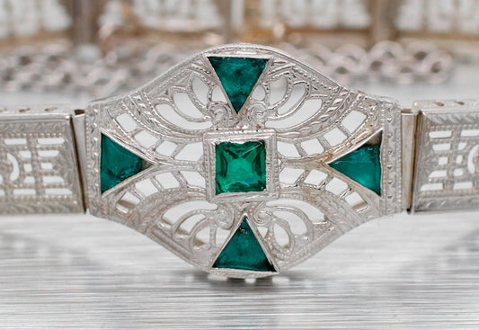 Antique Art Deco Green Emerald Filigree Bracelet - 14k White Gold - 7.75"