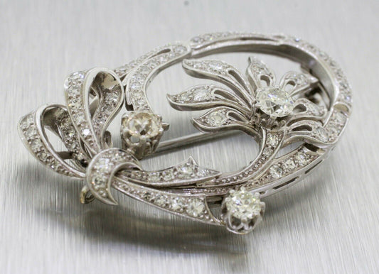 Antique Art Deco Platinum 3.00ctw F/VS2 Diamond Floral Oval Brooch Pendant
