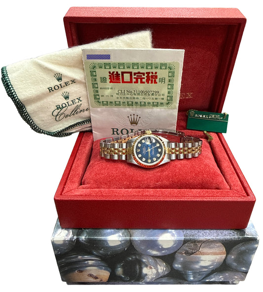 PAPERS Ladies Rolex DateJust BLUE VIGNETTE DIAMOND 18K Jubilee 26mm 79173 BOX