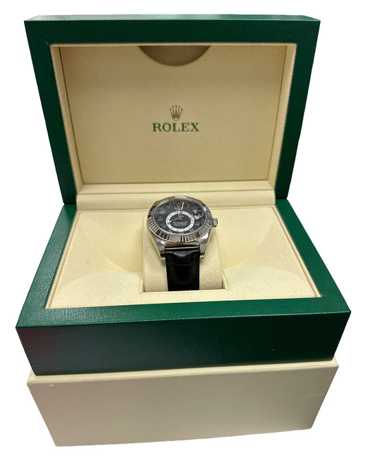 STICKERED Rolex Sky-Dweller BLACK ARABIC 18K White Gold Leather 42mm 326139 BOX