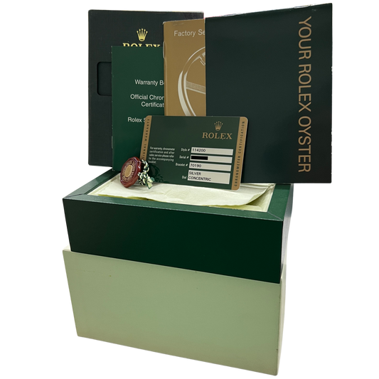 STICKERED PAPERS Rolex Oyster Perpetual SILVER CONCENTRIC Steel 34mm 114200 BOX
