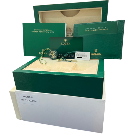 1987 PAPERS Rolex Oyster Perpetual Date 34mm Gold Leather SILVER Watch 15505 BOX