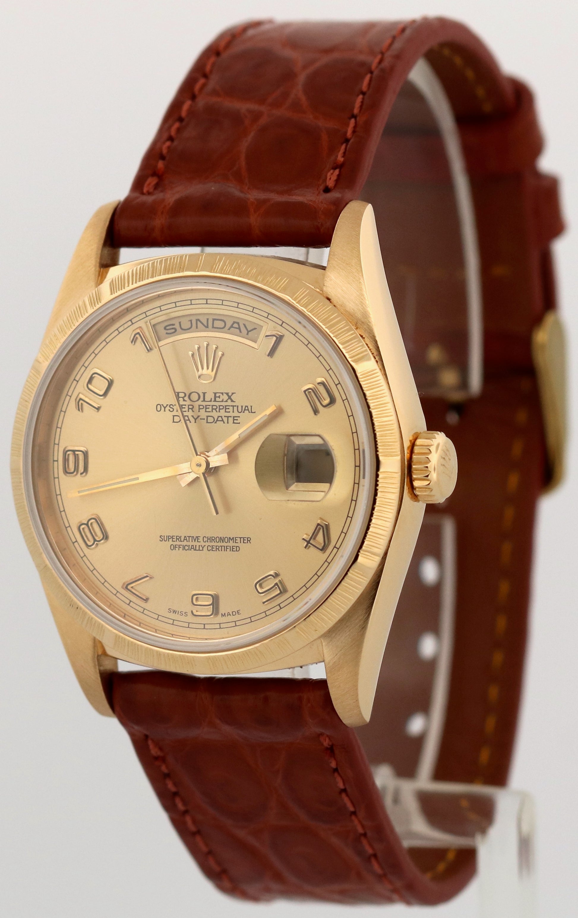1991 Rolex Day-Date 36mm CHAMPAGNE ARABIC 18K Gold BARK Leather Watch 18248