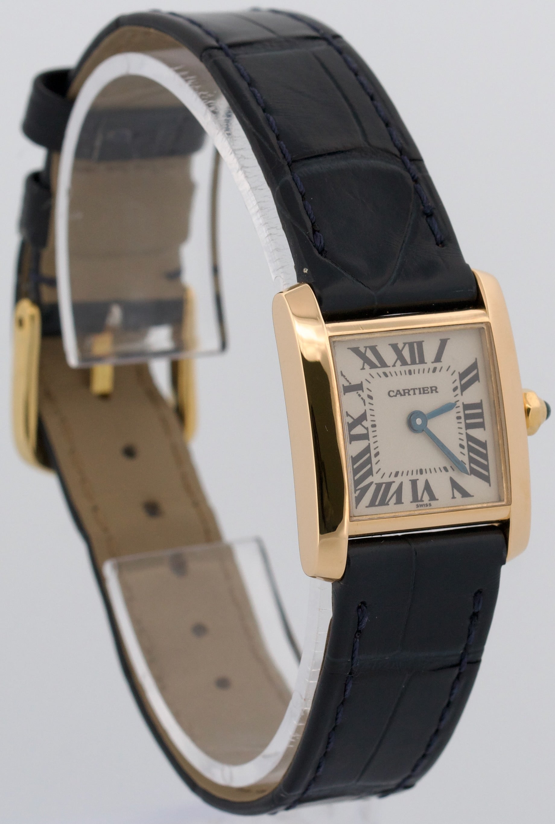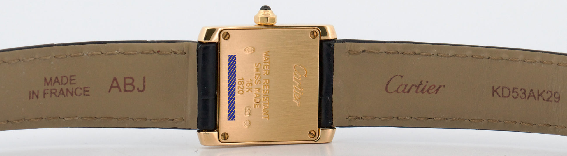 | Band | Blue Leather Strap with Custom Gold-Plated Tang Buckle |
