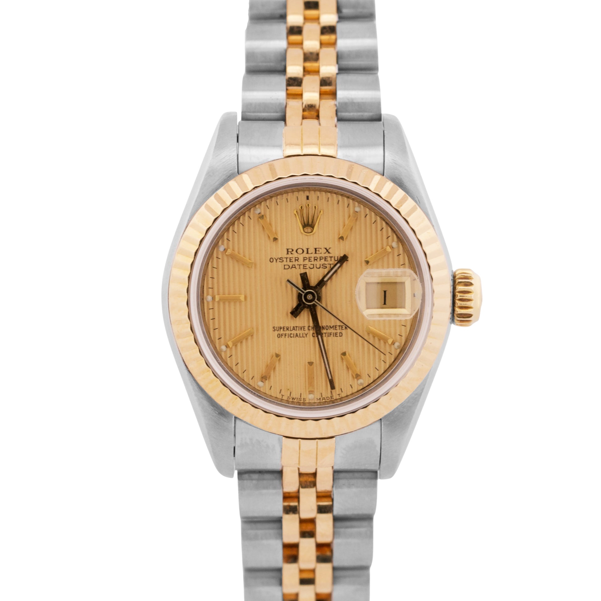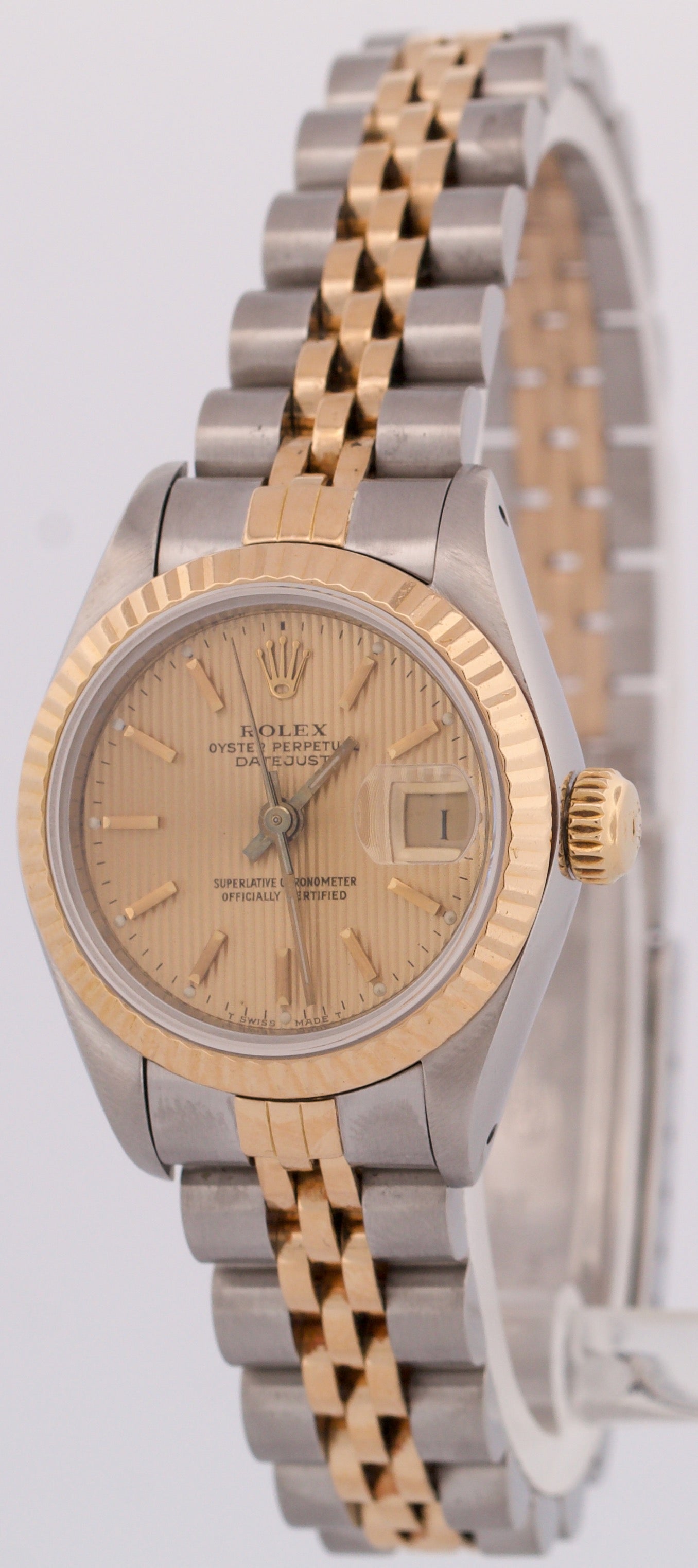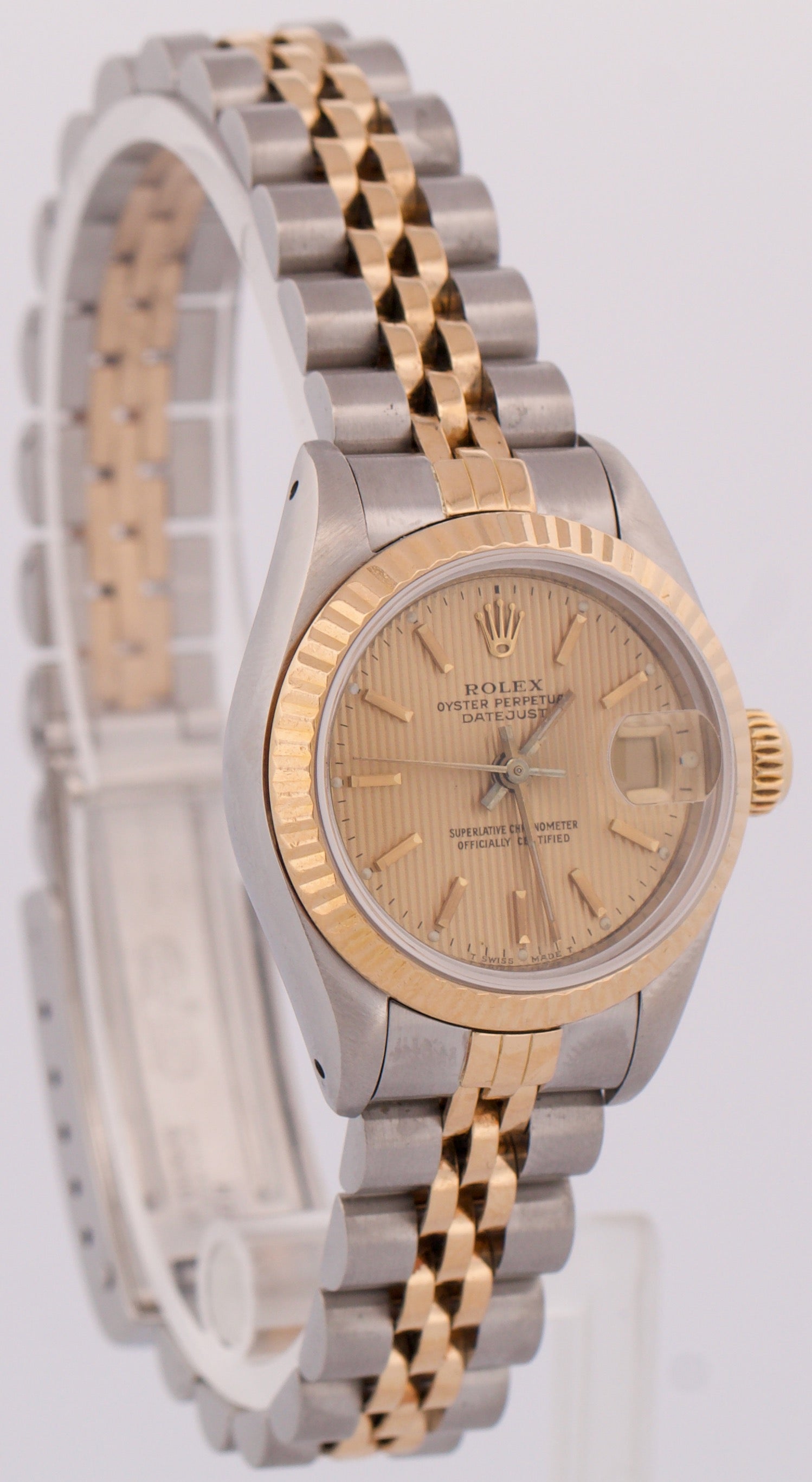 Ladies Rolex DateJust 26mm CHAMPAGNE TAPESTRY 18K Gold Steel JUBILEE 69173