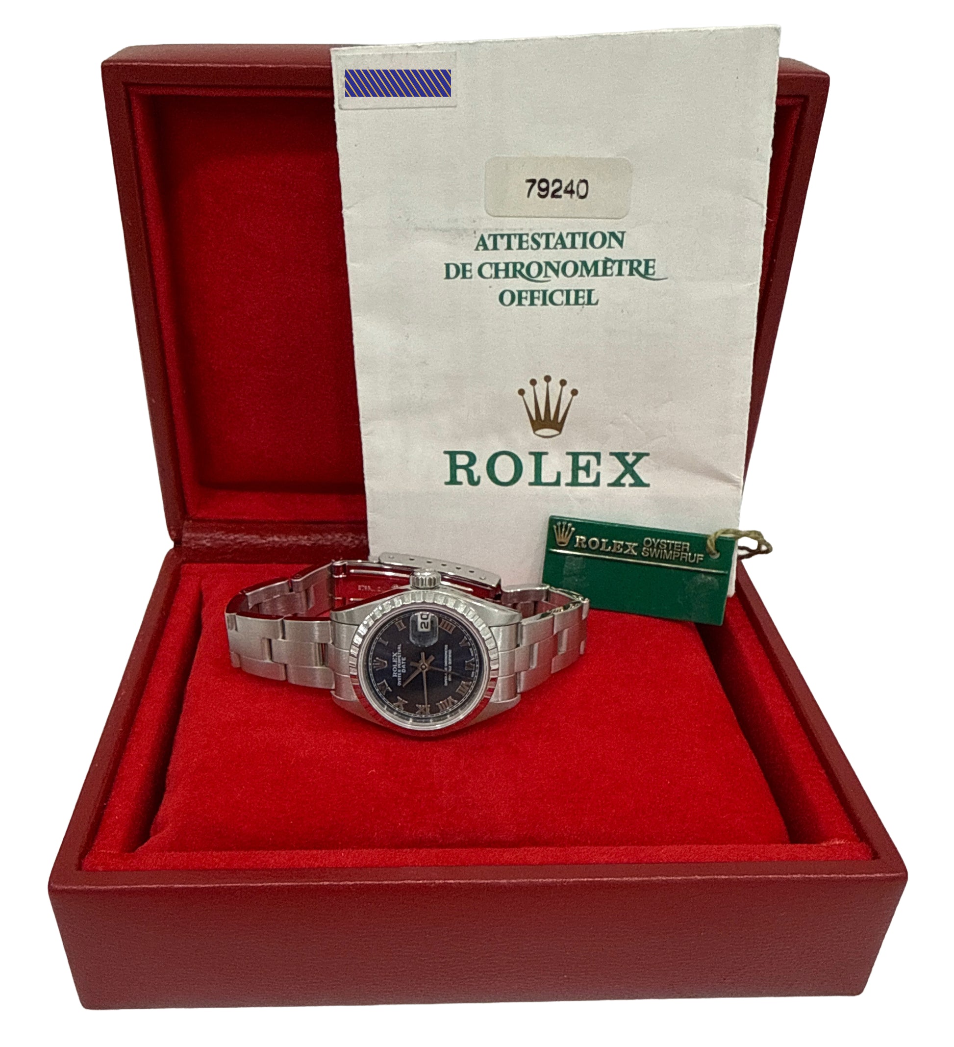 PAPERS Ladies Rolex DateJust BLUE ROMAN 26mm Engine-Turned Steel 79240 Watch BOX