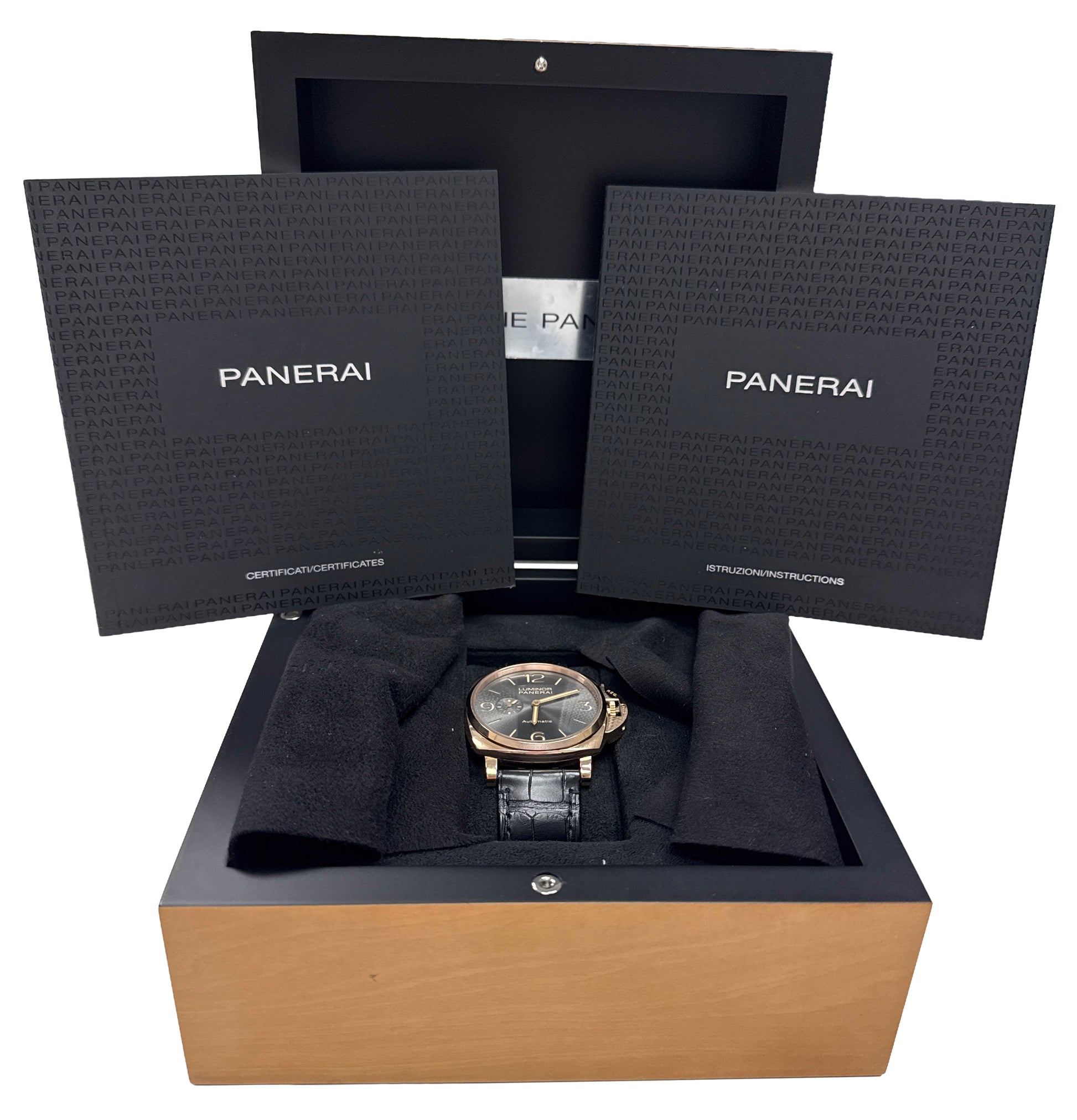 | Band | Panerai Black Leather Strap with 18K Rose Gold Tang Buckle |