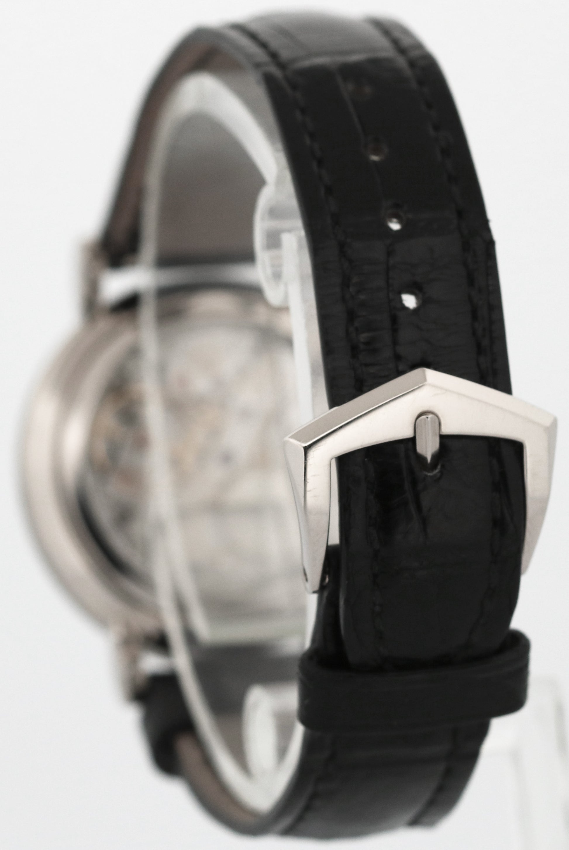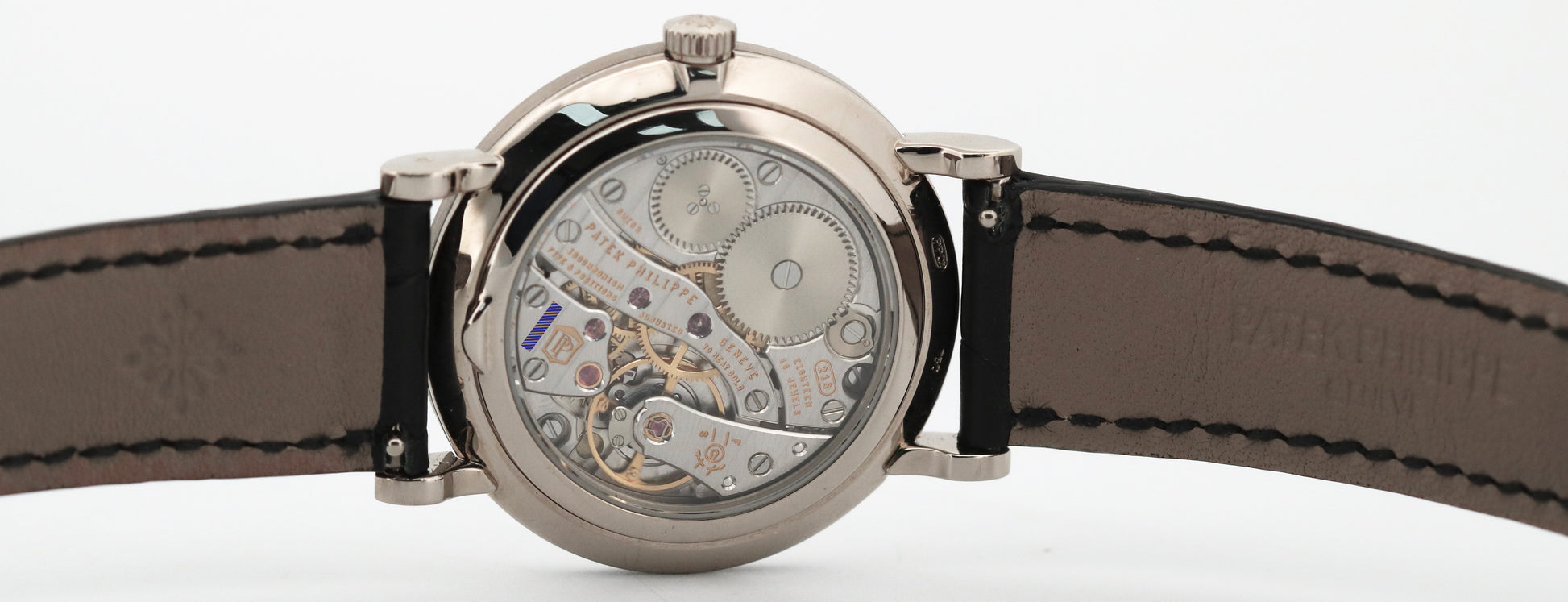 | Band | Patek Philippe Black Leather Strap and 18K White Gold Tang Buckle |