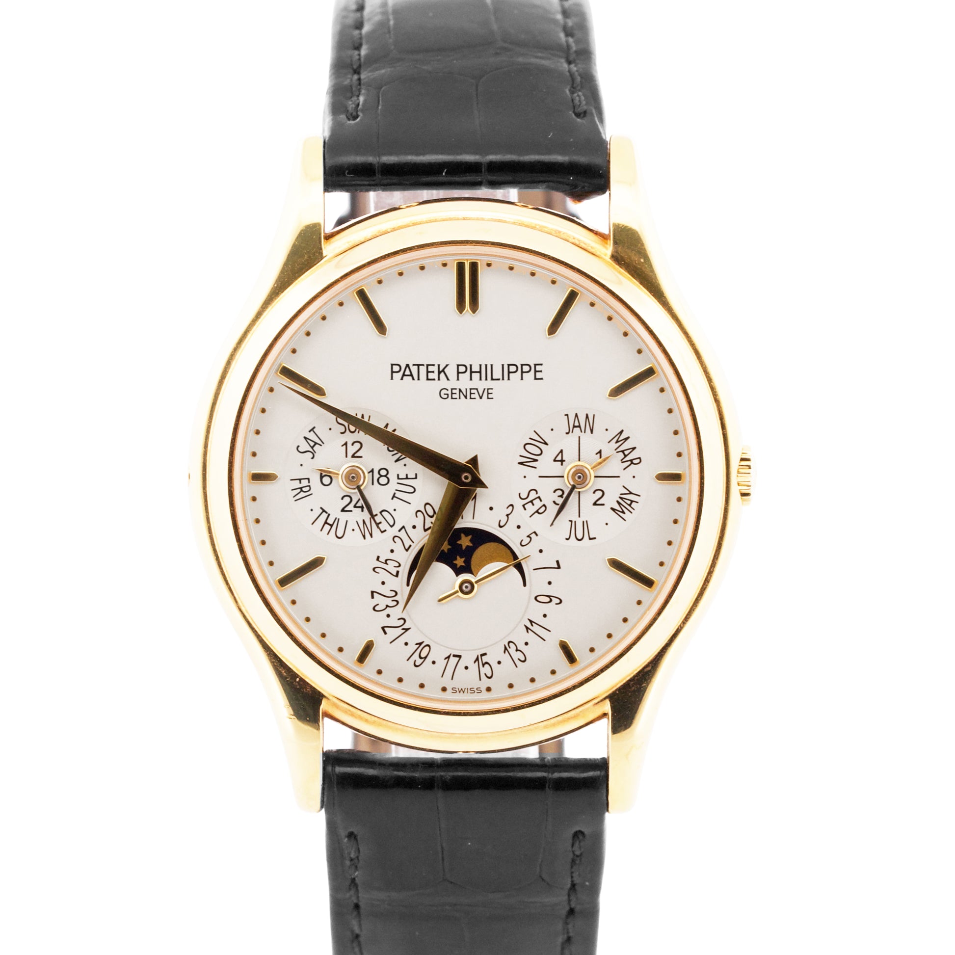 Band | Black Leather Strap with 18K Yellow Gold Patek Tang Buckle |