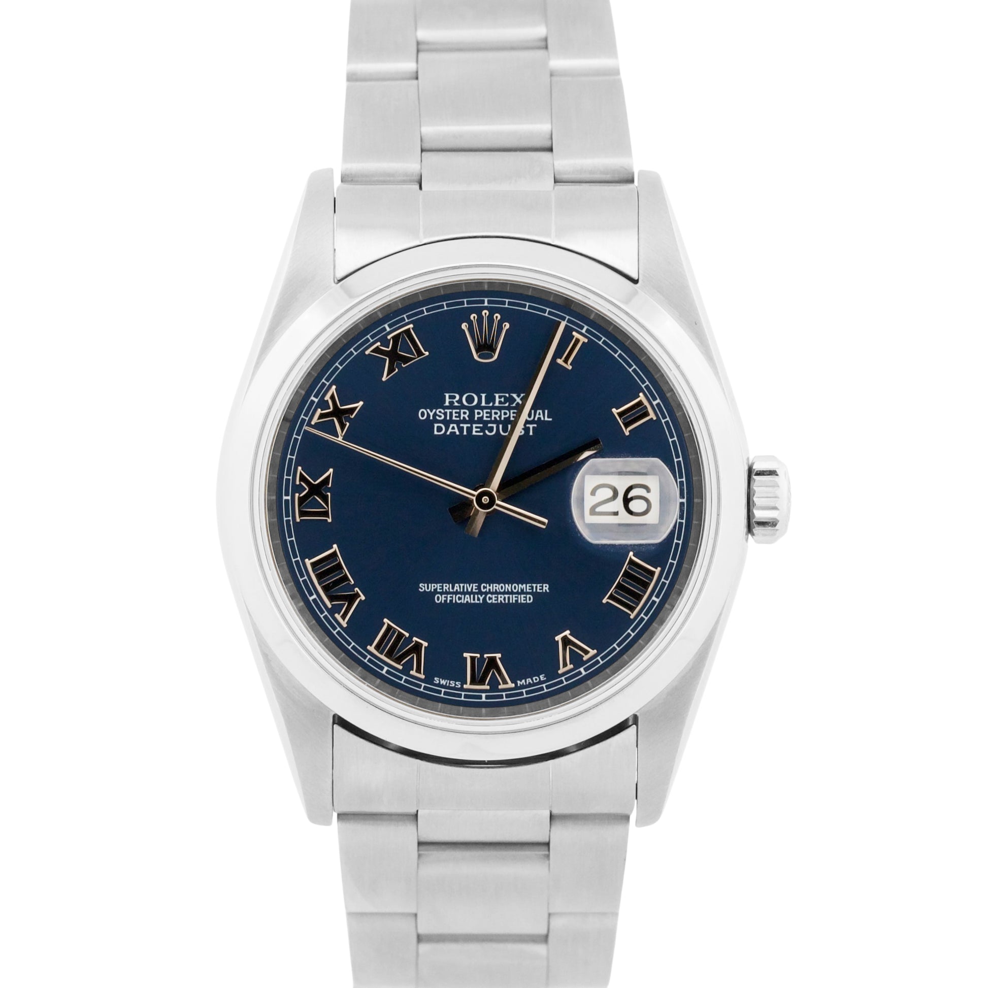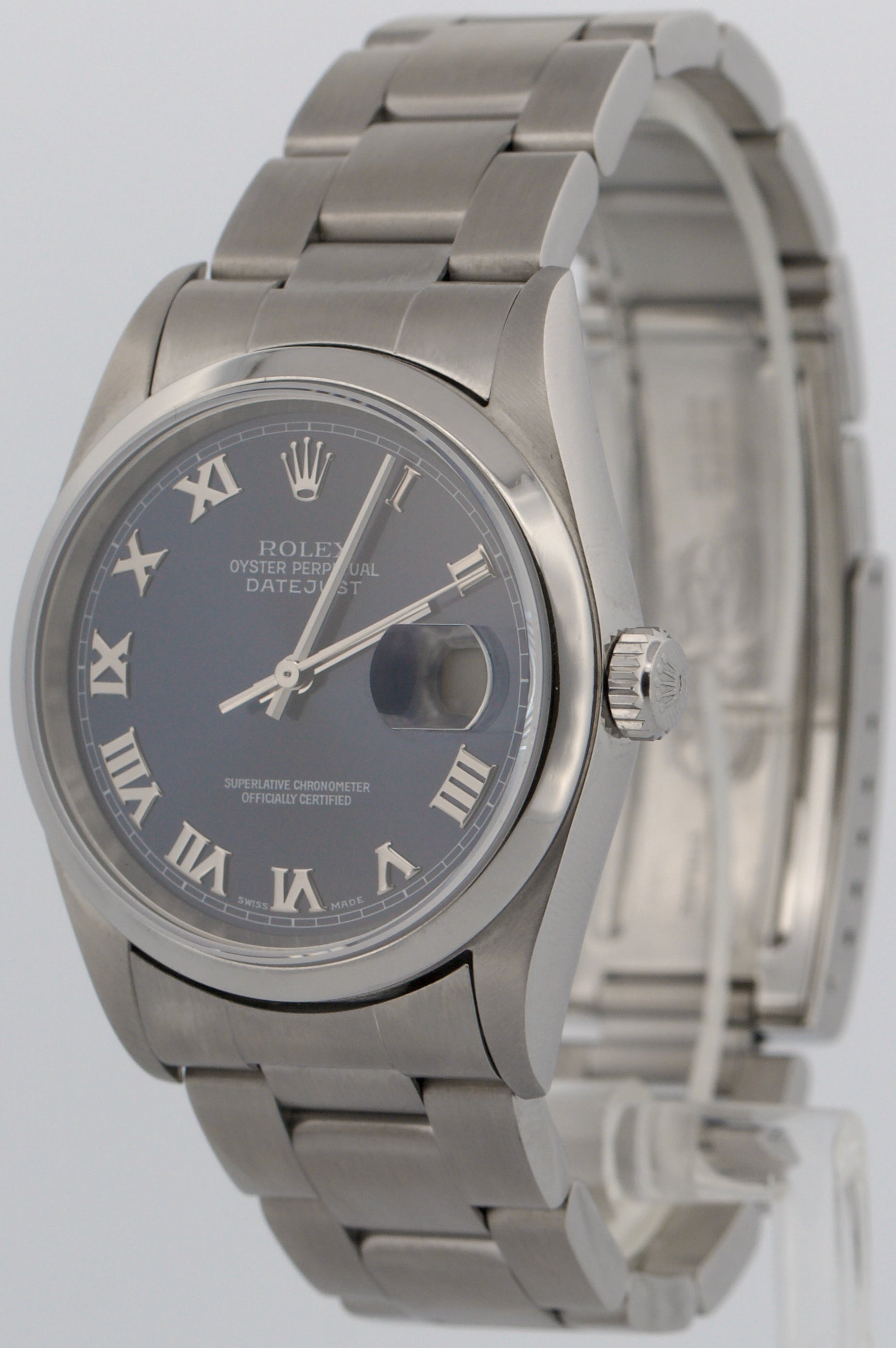 Rolex DateJust 36mm BLUE ROMAN Smooth Stainless Steel OYSTER Watch 16200
