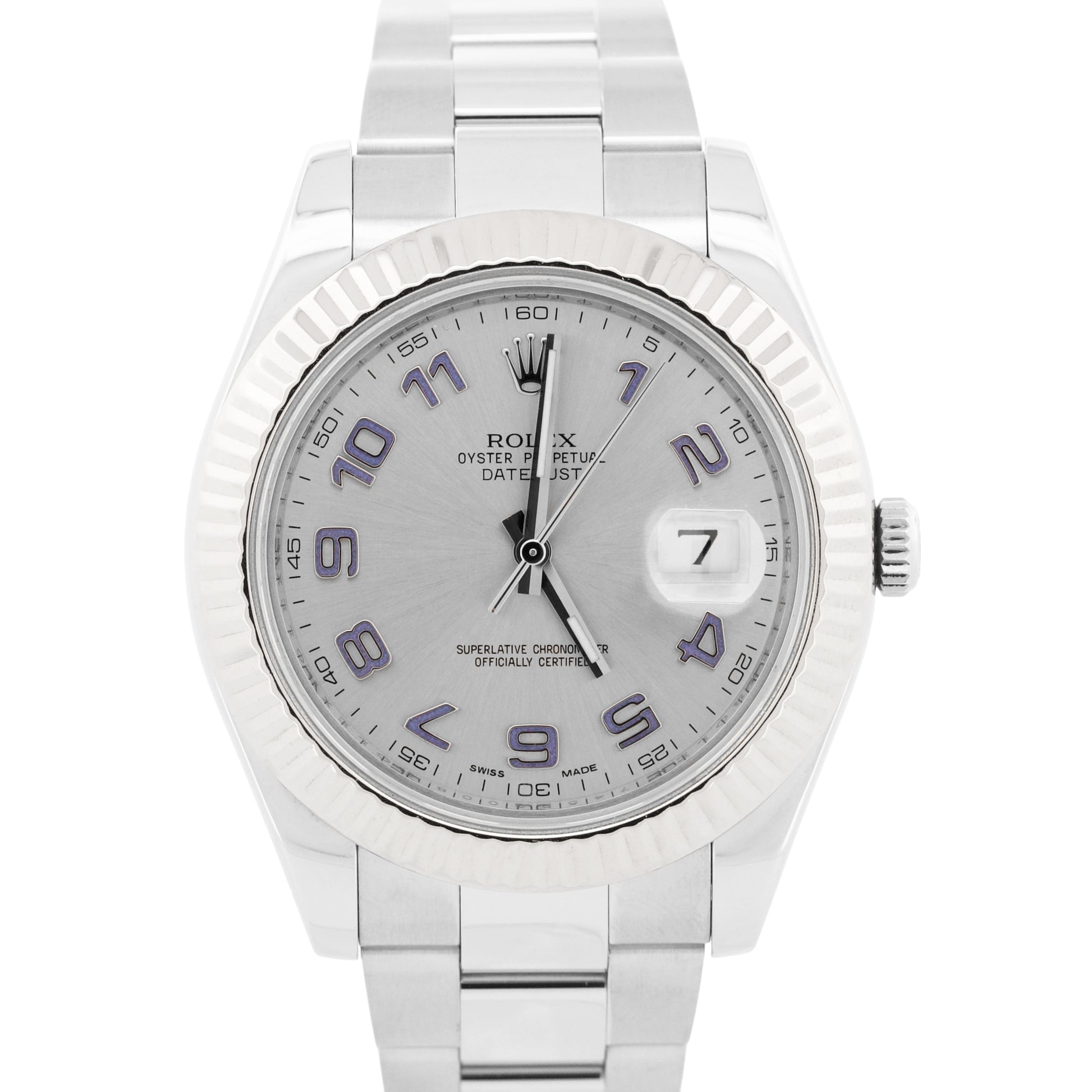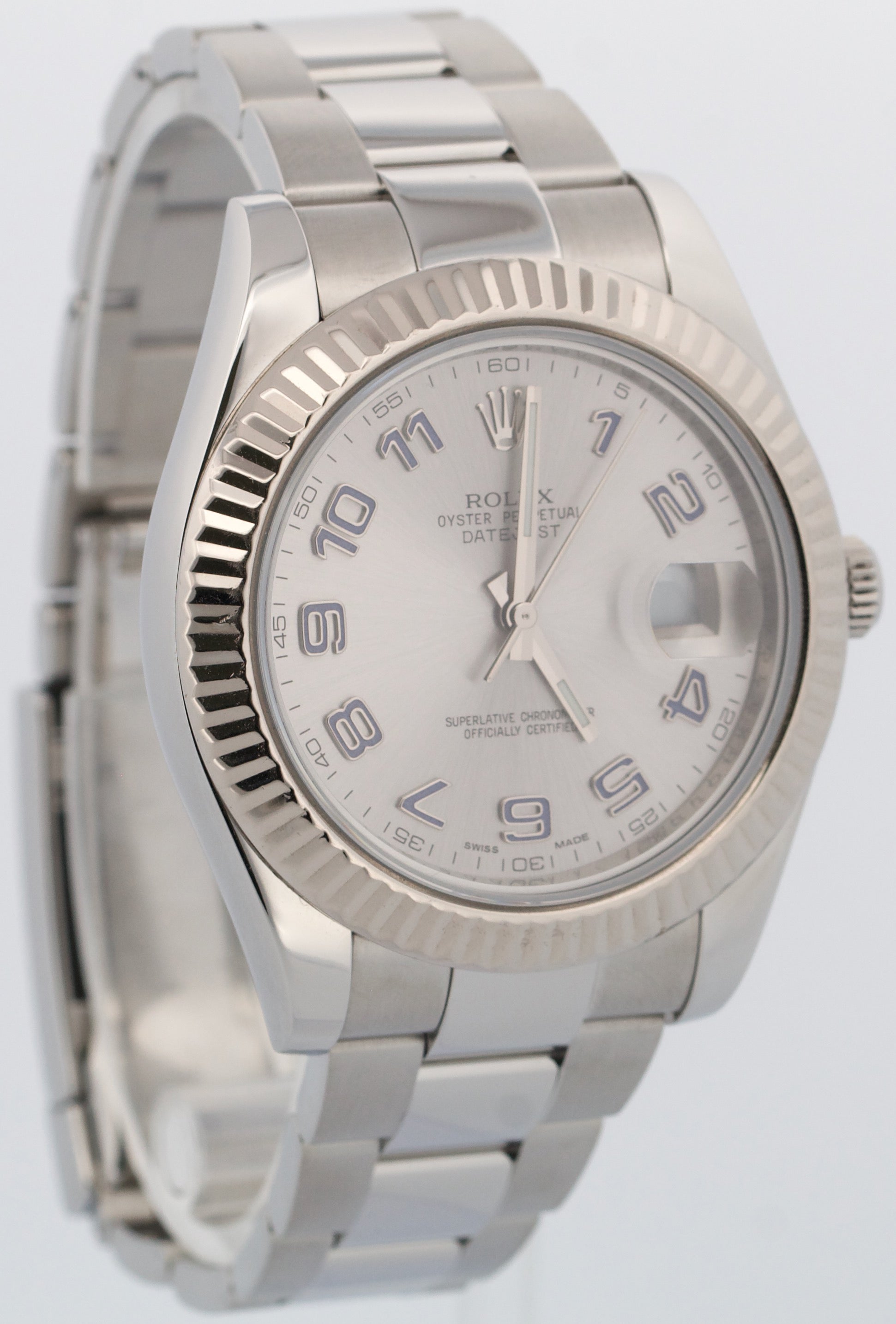 Rolex DateJust II 41mm SILVER Purple Arabic Steel 18K Gold Watch 116334 BOX