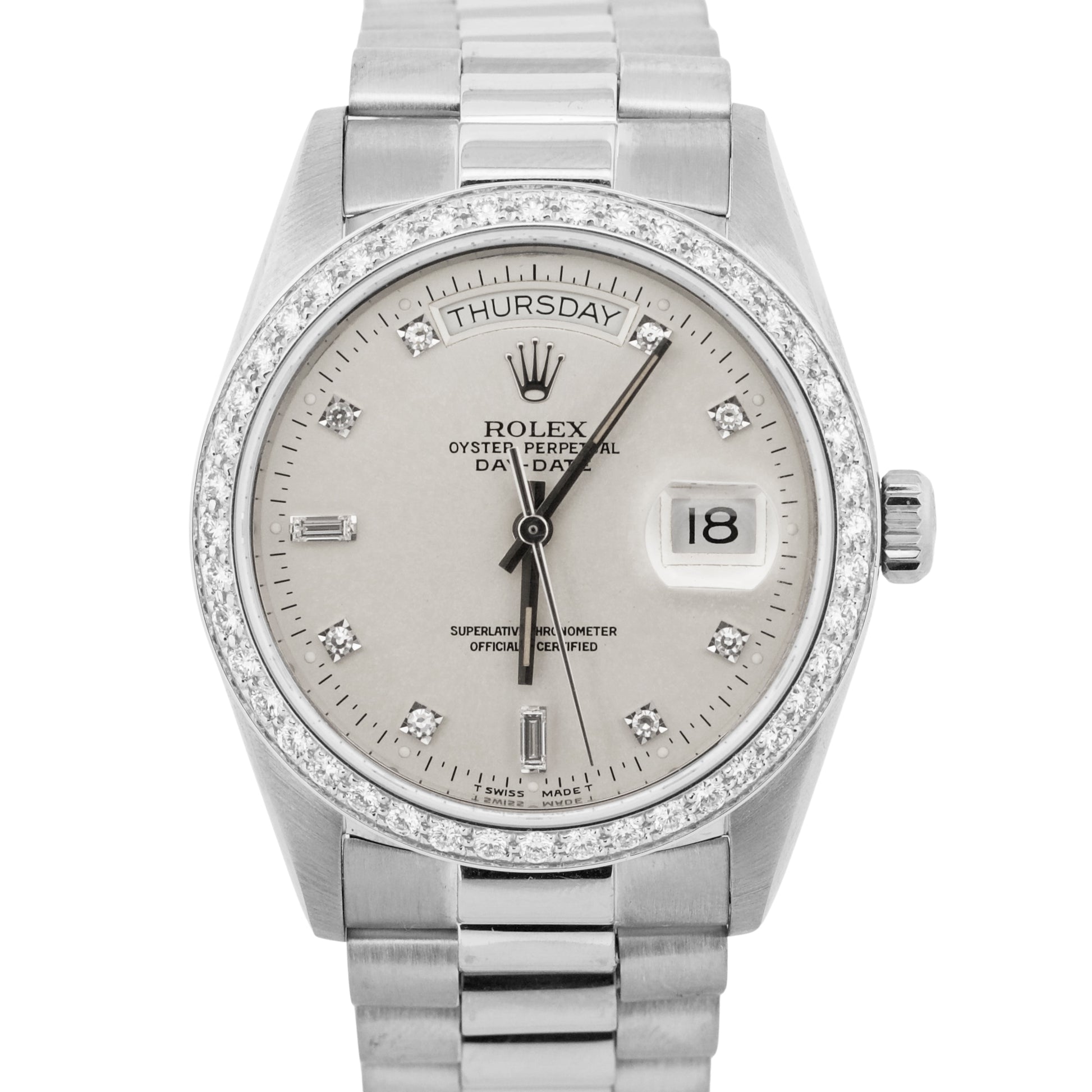 Rolex Day-Date President Silver FACTORY DIAMOND BEZEL 36mm 18K White Gold 18049