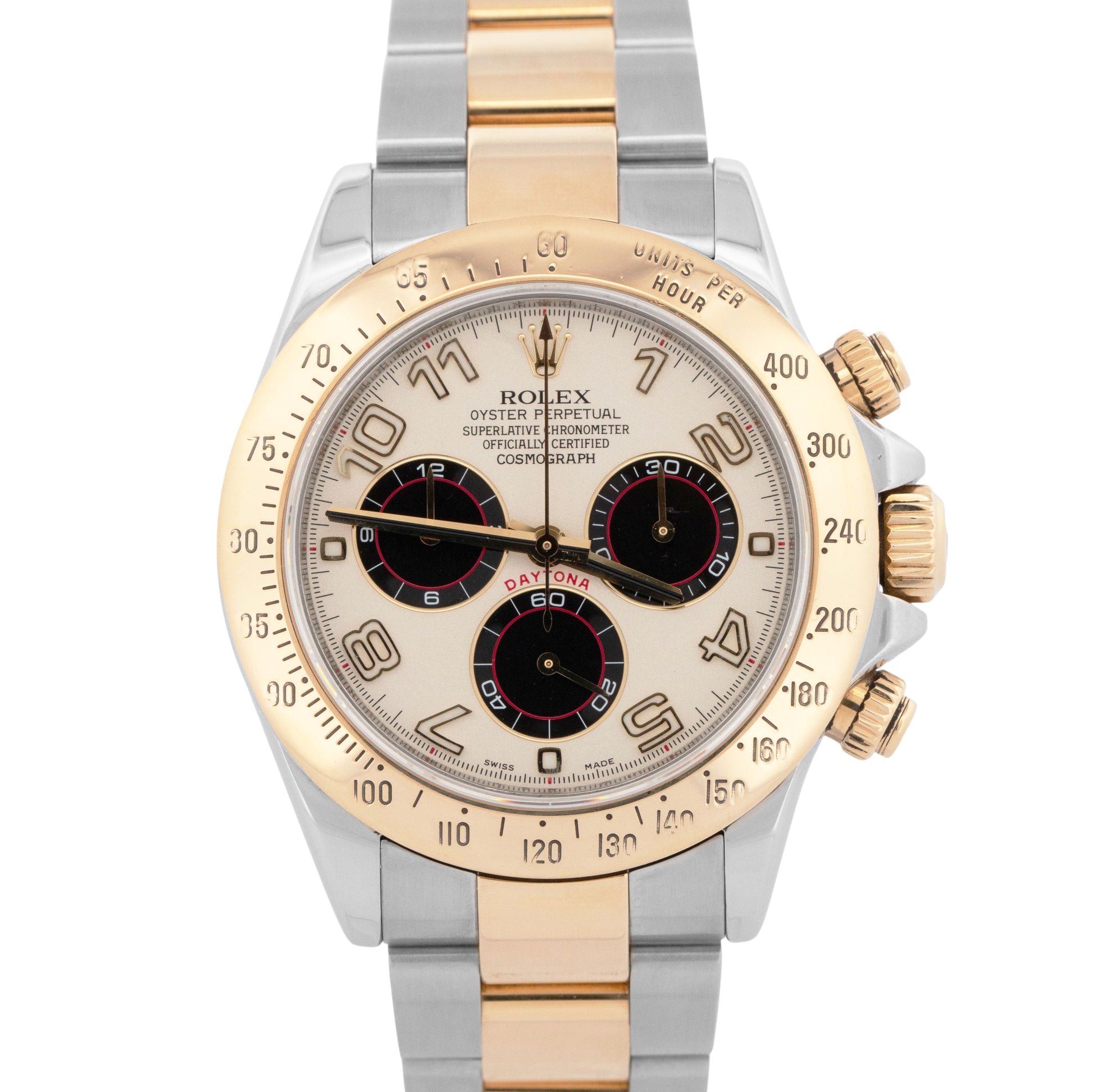 | Dial | Ivory "Racing" Arabic Numeral Chronograph Dial |