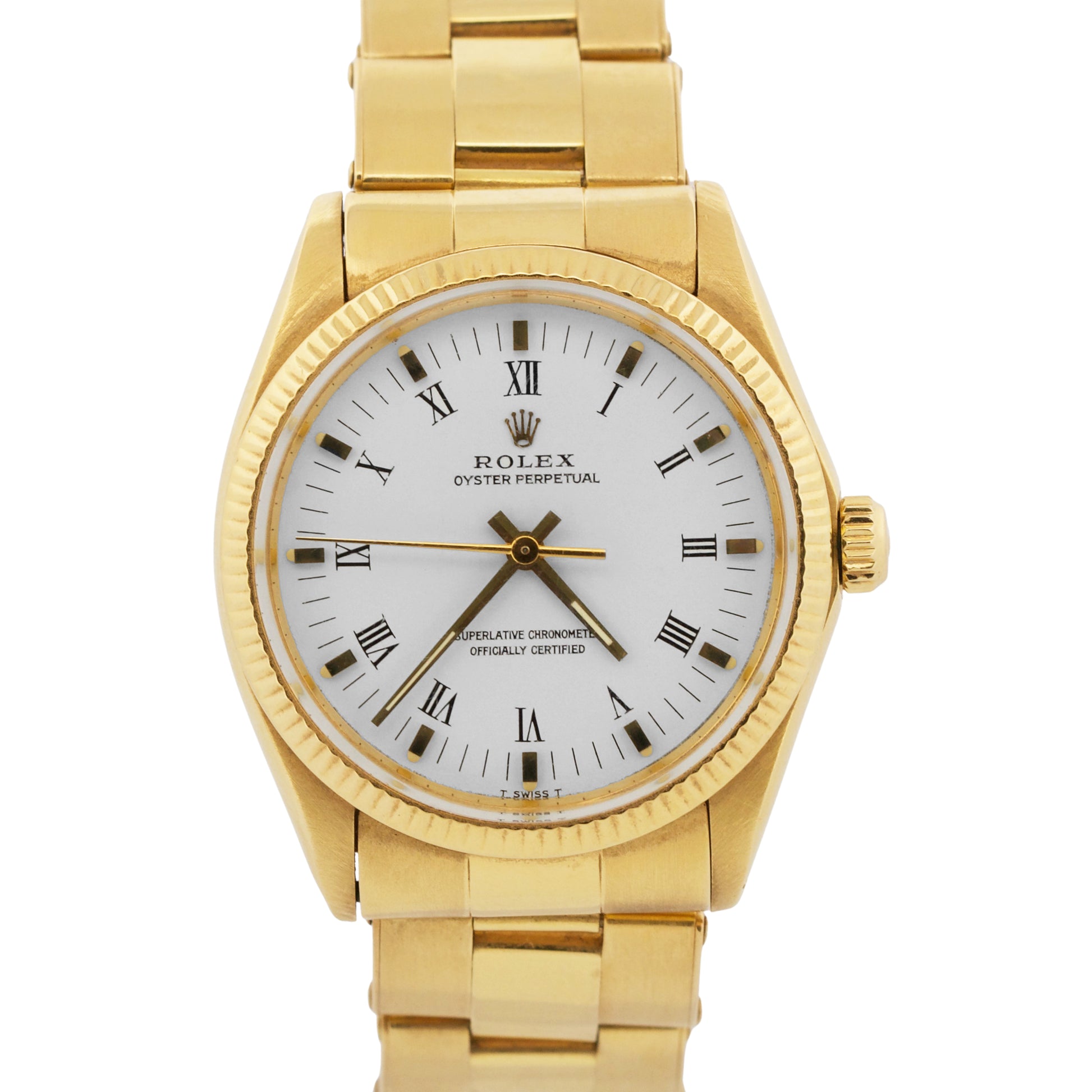 1981 Rolex Oyster Perpetual 34mm WHITE 18K Yellow Gold Fluted Oyster Watch 1005