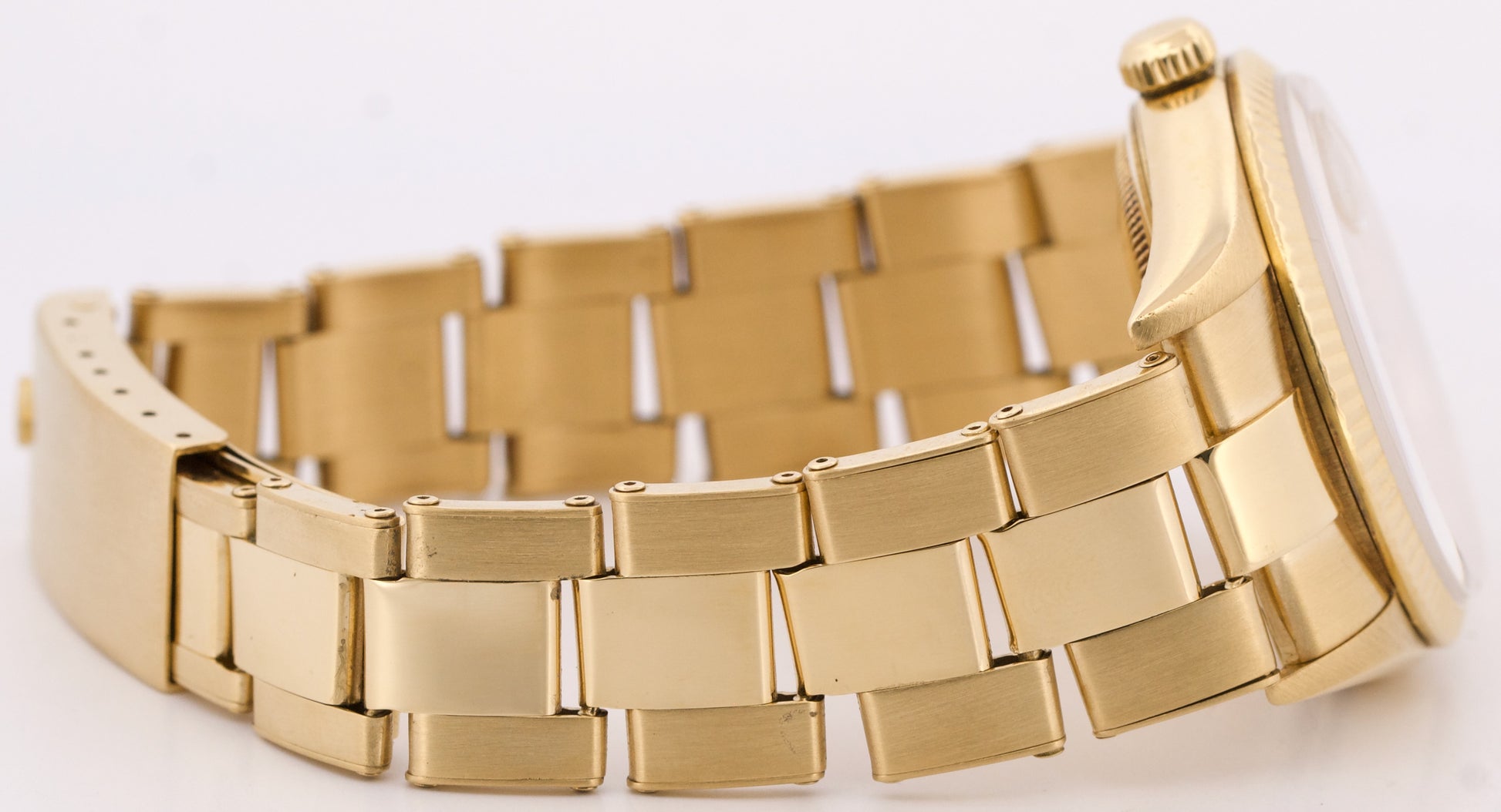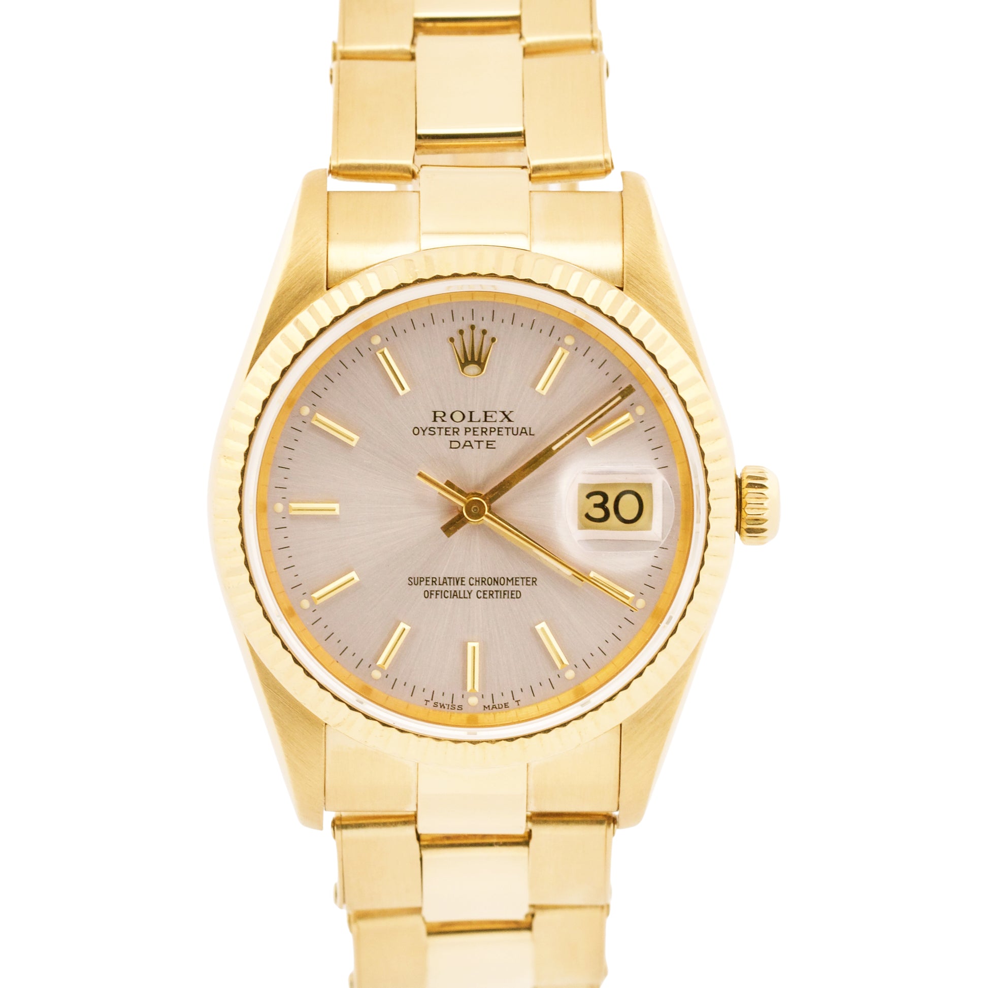 Rolex Oyster Perpetual Date 34mm SILVER 18K Yellow Gold FLUTED Watch 15238