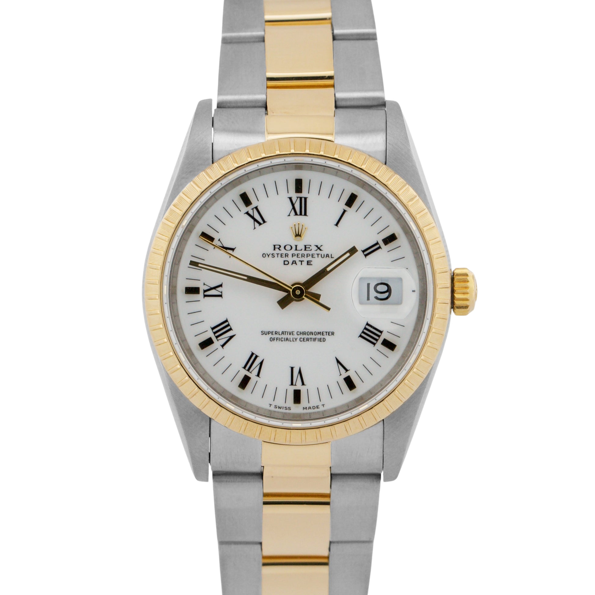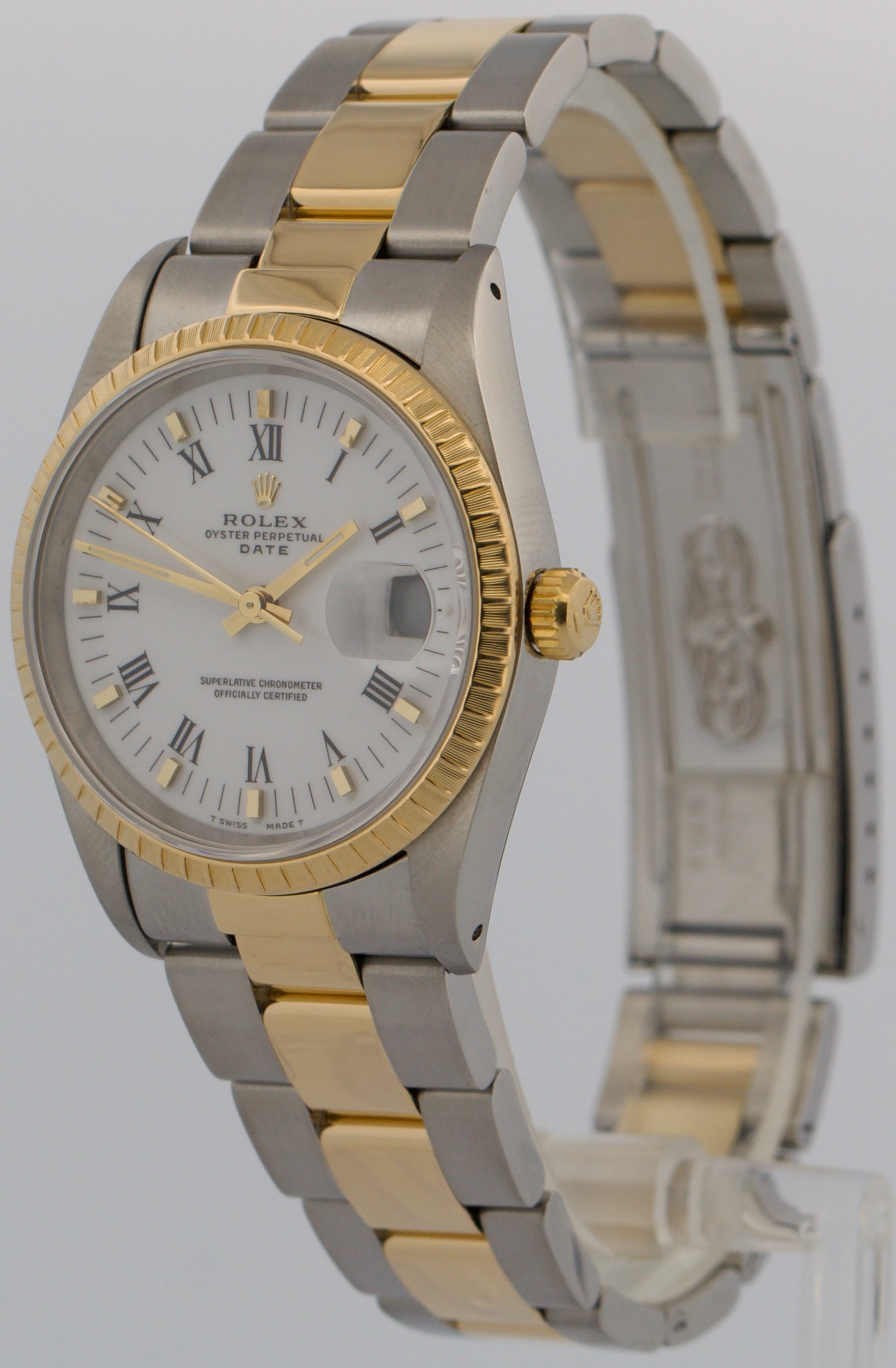 Rolex Oyster Perpetual Date 34mm WHITE ROMAN 18K Steel Engine-Turned 15233 Watch