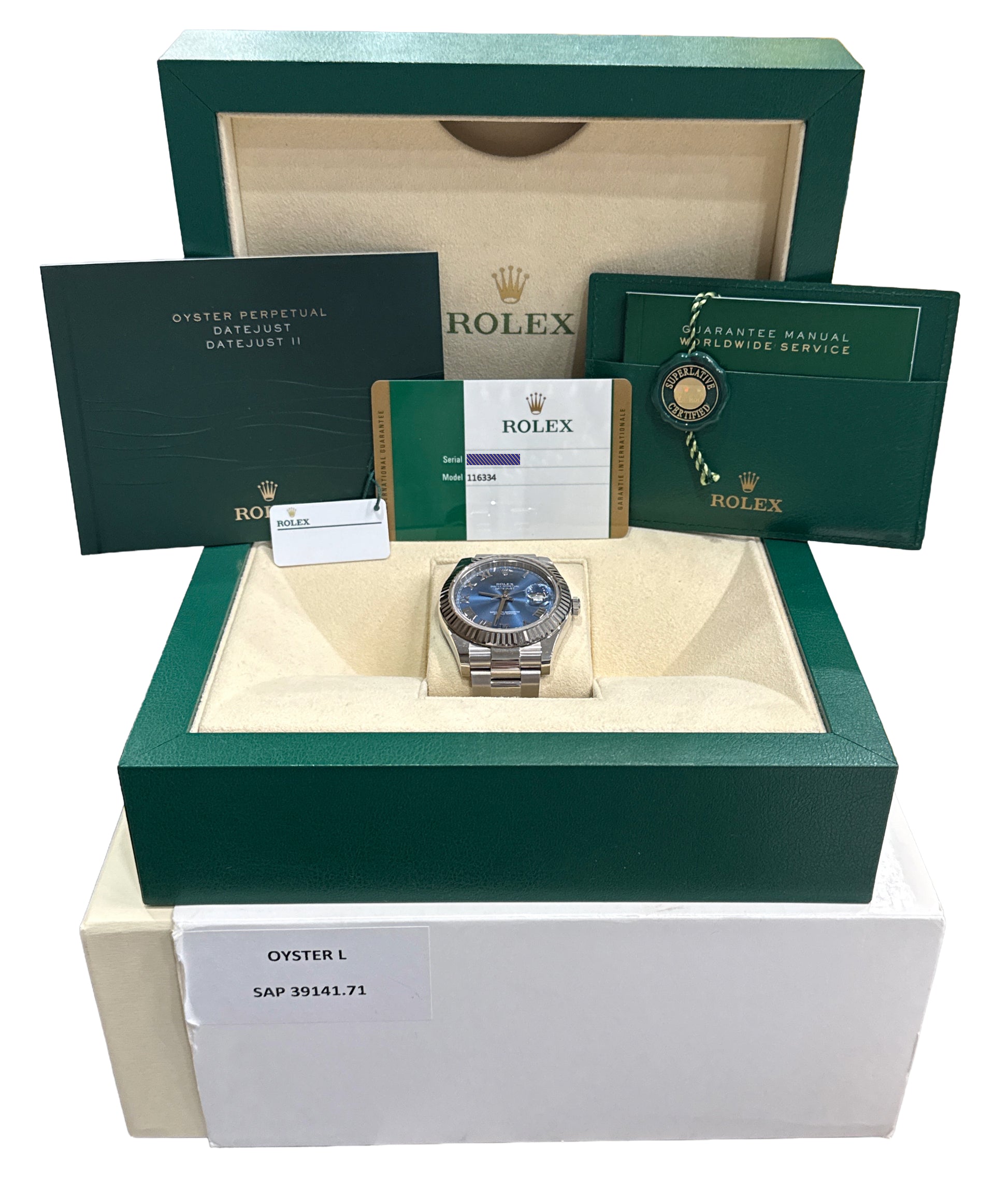 UNPOLISHED PAPERS Rolex DateJust II AZZURRO BLUE ROMAN 41mm 18K Steel 116334 BOX