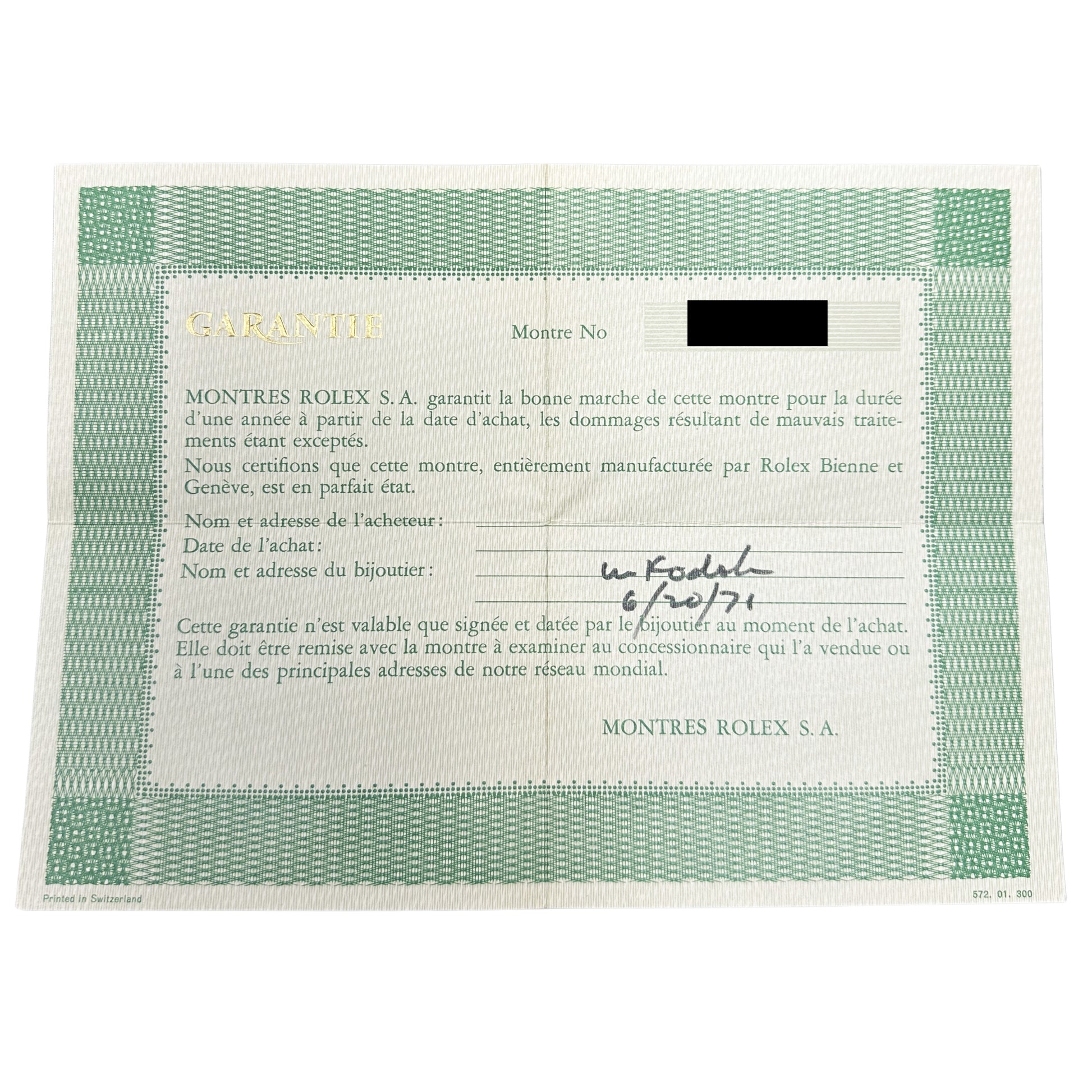 | Serial Number | (The Rolex Warranty Paper is Dated JUNE of 1971). |